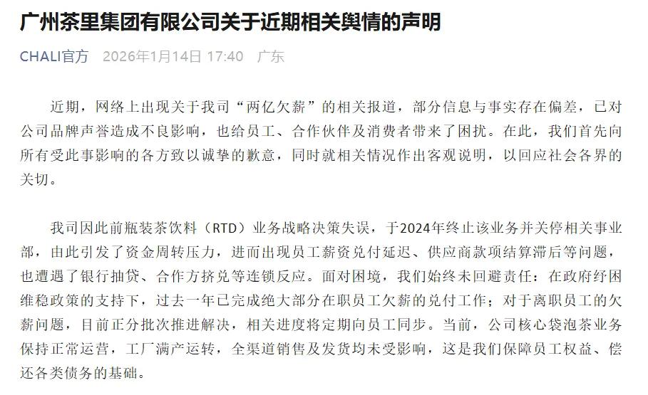 就在前不久,CHALI发布声明主动坦承是因瓶装茶饮料业务战略失误陷入资金周转危机。