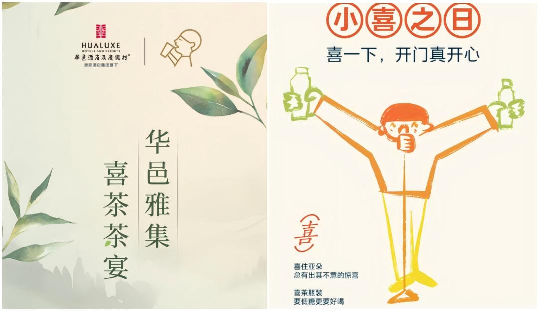 喜茶HEYTEA先是与亚朵联名推出主题房,其中喜茶瓶装饮料作为入住亚朵酒店的赠礼,随后又与华邑酒店携手打造华邑雅集·喜茶茶宴。